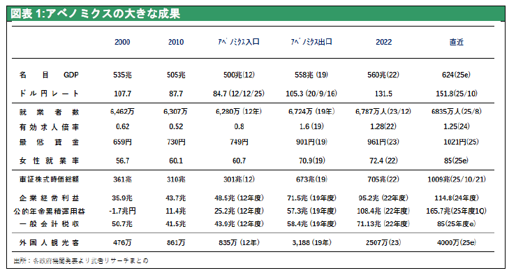 1)稼ぐ力➡2012年12月第二次安倍政権発足時の日本の稼ぐ力は奈落の底にあった。2000年以降10数年にわたって名目GDPは500兆円前後、法人企業利益は40兆円前後で低迷し、株式時価総額や税収は、10年前に比べ1~2割減少し、1ドル85円の超円高の下で日本企業の競争力は地に落ち、総力を結集した日の丸半導体エルピーダメモリは破綻した。雇用も10年間で5%減少した。安倍政権が投資や国民生活向上に振り向けることが出来る原資は全くなかった。それに対して高市政権船出の現在、アベノミクスの成功と円高是正により企業収益は劇的に改善し、税収は倍増、株式時価総額は4倍となり国民の富は激増している。政府には恒常的税収の上振れ(年間6~10兆円)に加えて、米国国債保有の為替益40兆円、日銀ETF投資含み益50兆円、GPIF累積運用益166兆円等、巨額の隠れた投資原資もある。図表1をじっくりとご覧いただきたい。いかに高市政権の船出が投資余力に恵まれているかは、クリスタルクリアであろう。