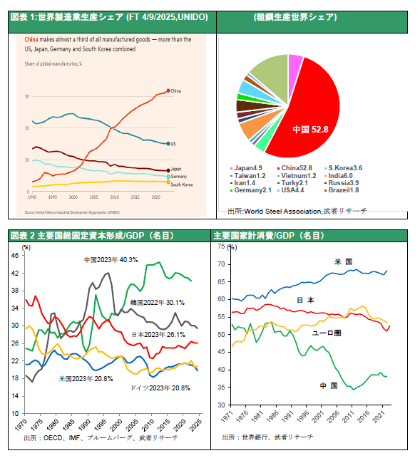 世界人口の17%に過ぎない中国は世界製造業生産の4割弱(米国の2倍強・・・PPPベース武者リサーチ試算)を集積し、鉄鋼5割、造船7割、スマホ、ドローン8割、PC、TV9割の高世界シェアを獲得している。特にグリーンエネルギー関連ではソーラパネル、EV、バッテリー、風力発電設備などで世界シェア6~8割と圧倒し他国の産業基盤を破壊している。更に米国から輸出規制をかけられてきた半導体では過去数年間、世界の半導体設備投資の3~4割と言う高投資を続け、パワー半導体、アナログ半導体、DRAMなどのレーガシー半導体と言われる分野で著しく競争力を強め、各国への低価格供給を始めている。また新質生産力におけるニュートリオと言われている太陽光パネル、電気自動車、リチウムイオン電池の輸出の大幅増加が、国内需要の低迷をカバーしてきた。自動車までが、日本を抜いて世界最大の輸出国になった。この過剰な供給力が中国国内だけではなく全世界にデフレ圧力を及ぼしている。2025年の中国貿易黒字は1兆1500億ドル程度(1~11月で1兆758億ドル)と世界GDP比1%の巨額に達した。