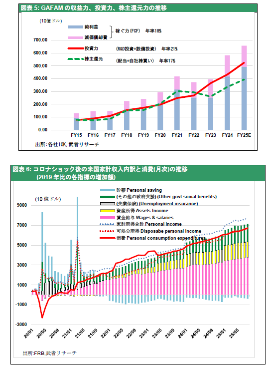 当面データセンター投資などAI設備の初期投資が急増し、経済を押し上げている。またGAFAMなどのハイテク企業はAIを活用した新サービスを立ち上げ、利益成長を加速させている。しかしAIは市場調査、書類作成、グラフィックデザイン、プログラミング等ホワイトカラーの職を奪い労働需給の悪化も引き起こしている。増加する企業利益を如何に家計所得と消費増加につなげるのか、手立てが必要である。図表6はコロナショック後の月次家計収入と消費の増加趨勢(年率換算)を見たものだが、賃金は家計所得増加の半分に過ぎず、残りが配当・金利等の資産所得と財政支援によって賄われていることが分かる。この家計所得には資産売却益は含まれていないが、それを考慮すれば家計所得の株式関連所得依存度は2~3割を超えるだろう。家計が貯蓄を取り崩して消費を続けてきたのは膨大な資産価格上昇の評価益があったからこそである。このように余剰フローの主経路として株式市場が決定的な役割を果たしている。