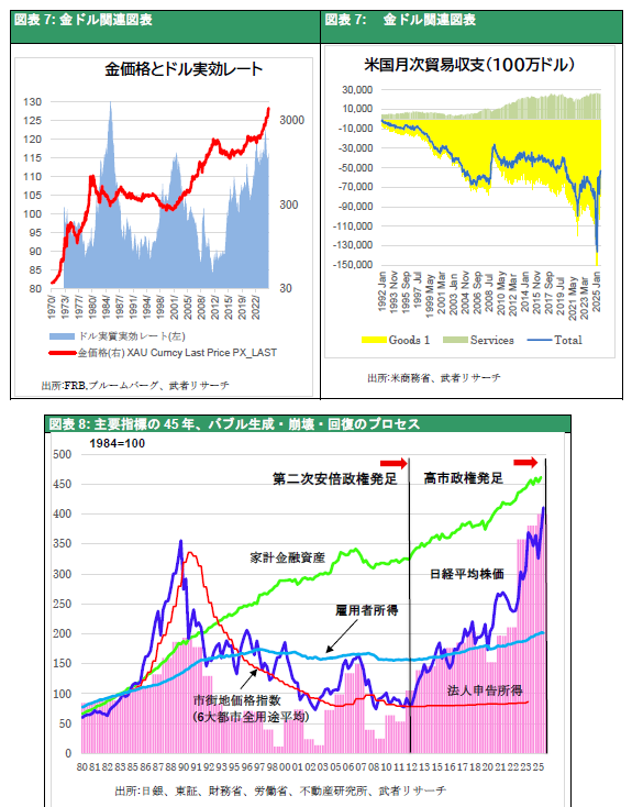 執拗に上昇を続ける金価格がドル不安の高まりの現れ、との懸念があるがそれは正しくない。過去を検証すると金とドルとの連動関係は、2002年から2011年のドル下落が金上昇と一致しているにすぎない。ドルは米国の貿易収支(対GDP)との相関が強いが、米国貿易赤字は関税導入以降大きく減少しており、それはドル高要因と言える(図表7参照)。では金価格上昇は何によってもたらされているのだろうか。ドル決済から締め出されたロシアや中国の金保有の増加が第一の要因であるが、それ以上にドル信用の供給量と連動していると考えられる。1980年の金高はニクソンショック(ドル金交換停止)による信用増大、2011年までの金高はグラススティーガル法廃止による信用増大と照応している。では今米国で増大が進行しそうな信用とは何か、それは仮想通貨かもしれない。