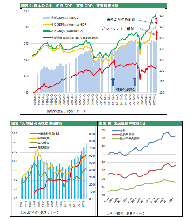 但し国民生活は失われた30年のままである。実質家計消費は2012年度末302兆円、2013年度末311兆円に対して2025年3Q298兆円(2020年基準)と、むしろ低下している。経済成長率もG7の中でも最低水準が続いている。デフレ経済下で強行された「社会保障と税の一体改革」により国民負担率が、2011年度の38.8%が2022年度48.4%、2024年度(推)46.2%と急上昇したためである。しかしこれから高市政権の高圧経済政策による減税が打ち出され、実質消費も回復し始めるだろう。国内投資も上向き、消費と投資の拡大好循環が起きることはほぼ確かである(図表9,10参照)。