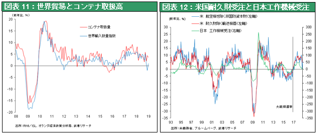 武者) 日本株は国際分業上、資本財・生産財に特化し、最も景気変動に敏感です。故に昨年末からの生産下落の影響を強く受けました。それは今後大きく反発する条件になります。米国半導体株価の動きはすでに反発局面に入っていることを示唆しています。図表11世界貿易とコンテナ取扱高、12米国耐久財受注と日本工作機械受注の二つは、世界の物量(ハードウェア)経済の短期循環を示します。2018年に中国の改革(引き締め)と米中貿易戦争で失速しましたが、山は低く、早晩底入れはほぼ確実でしょう。