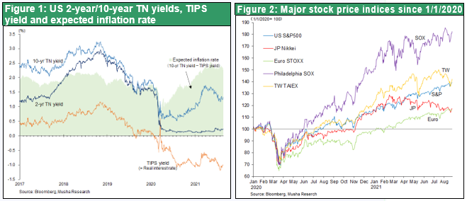 1) Is tapering (decrease in asset purchases) a factor in rising interest rates or not? Common sense suggests that it is a factor in raising interest rates. However, concerns about tapering have been on the rise since February and March 2021, and at the FOMC meeting in July, the majority opinion was that tapering would start within the year. Despite this, long-term interest rates have declined for the past five months. This is the opposite of common sense. The decline in interest rates may be a sign that the Market is anticipating that tapering will cause the economy to slow down, but the fact that U.S. stock prices have been hitting record highs during this period does not support that interpretation.