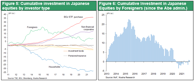 Japanese equities have been surprisingly strong in 2021. Even though the Bank of Japan and foreign investors, the two main buyers of Japanese stocks, stopped supporting the market, Japanese stocks remained in positive territory year on year. (1) The Bank of Japan almost stopped purchasing ETFs, (2) foreigners sold Japanese stocks, partly due to the decline in the number of stocks included in the MSIC indexes, and (3) SoftBank Group (7% of the index), which has a large influence on the index, saw its profits fall sharply (from ¥5 trillion in FY2020 to less than ¥3 trillion due to the sharp fall in Alibaba's share price). In spite of the bad news, the adjustment from the post-bubble high of 30,700 yen was modest. In 2022, these negative factors will have run their course.