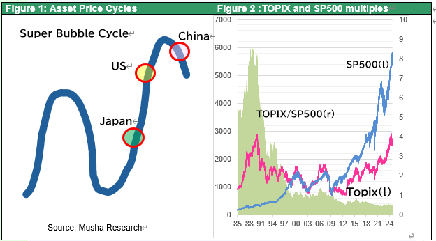 The asset price cycles of major countries are illustrated in Figure 1. China is just past the peak of the cycle and should curb asset investment and stick to the cash is King policy. In the U.S., asset prices are generally in a state of fair value, but if interest rates surge, the country is on the verge of a yellow light, which would immediately turn into a bubble. A balanced asset allocation is desirable. In contrast, in Japan, asset prices are undervalued even though it has been some time since the bottoming out after the burst of the bubble economy. The risk of investing in Japan is precisely the risk of not owning Japanese stocks. The “Ueda shock” and the “Ishiba shock,” the two policy shocks that dampened the sharp rise in stock prices since the beginning of this year, have abnormally increased the volatility of Japanese equities, further increasing their undervaluation (i.e., high risk premium). Japanese equities have continued to stray near their all-time highs due to pre-election uncertainty. However, unless a Constitutional Democratic Party of Japan (DPJ) government is formed, which has proposed a genuine deflationary policy of higher interest rates and fiscal austerity (unlikely), post-election buying of Japanese stocks is inevitable, and the Nikkei Stock Average will reach 42,000-45,000 yen within the year and 50,000 yen by early 2025.
