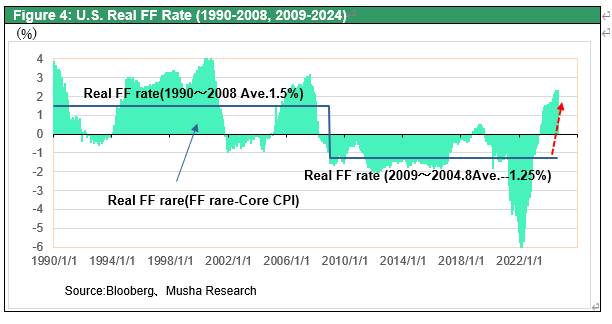 This strong appetite for risk-taking is also consistent with the sharp rise in the U.S. natural rate of interest (≒ real FF rate) as seen in Figure 4. Economic sentiment has fully recovered from the post-Lehman Brothers' collapse atrophy, and people are putting more emphasis on risk-taking. We are now in a situation in which a high interest rate (= brake) is necessary to achieve sustainable full employment growth.