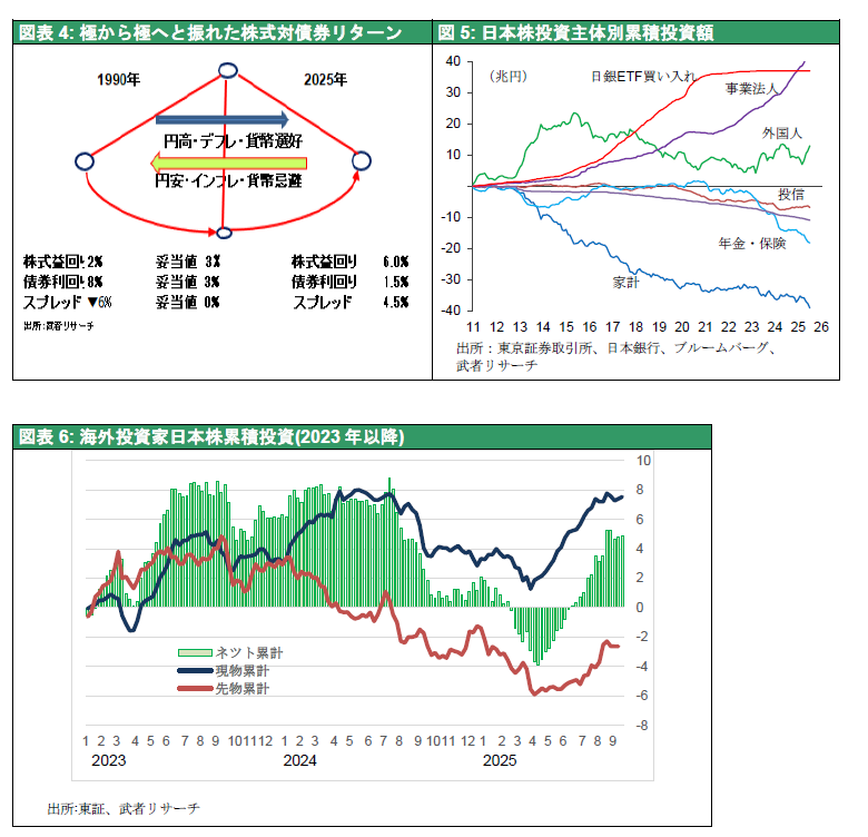このように全ての投資主体が日本株に向かって押し出されている。日本で株式主体の資金運用体制が怒涛の勢いで始まっていることは疑いない。昨年の植田ショック、石破ショック、今年のトランプ関税ショック等相次ぐ急落の度に、足止めを食らった日本株投資家は再度FOMO(日本株を持たざるリスク)を思い知らされていることだろう。以下の冷厳なデータを参照されたい。特に図表7の日米の歴史的バリュエーション推移を熟考されたい。