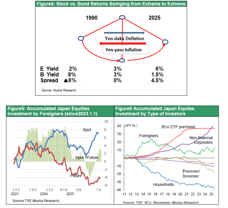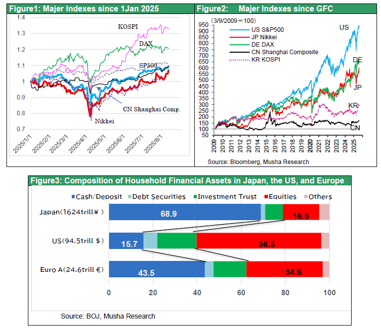 1) Foreign investors, previously the largest investors, not only failed to increase their holdings of Japanese stocks but sold all of them. They sold a net 12 trillion yen from August last year (during the Ueda shock) to April this year and are now buying back. However, they have only just bought back half of what they sold. 2) Among individual investors, the NISA reform has sparked an investment boom, with 8.8 trillion yen purchased from January to June 2025. This represents an annual pace of 20 trillion yen. While overseas investment trusts currently account for most purchases, a rapid shift toward Japanese stocks is likely to occur. 3) Corporate entities have significantly increased their share buybacks since last year. Reasons include requests from the Financial Services Agency and Tokyo Stock Exchange to correct valuations below a PBR of 1, concerns that excessive cash holdings could make them M&A targets, and the fact that buying back shares is the most advantageous use of surplus funds. According to TSE data, corporate net share purchases (Jan-Aug) are projected at ¥2.8 trillion in 2023, ¥4.5 trillion in 2024, and ¥7.6 trillion in 2025, maintaining a 70% year-on-year growth pace. 4) Institutional investors like pension funds are also being forced to reduce their Japanese government bond holdings and shift toward equities amid entrenched inflation and rising interest rates. Government requests for more aggressive public pension fund management, such as through the KKR-style public pension fund (KKR), are gaining traction.