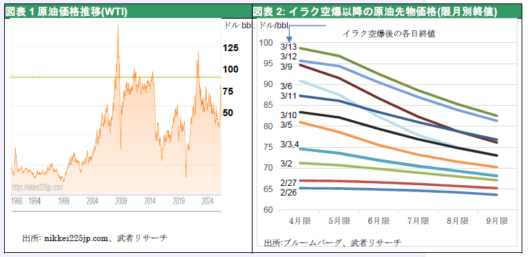 驚くべきはトランプ政権の横暴批判、出口なき戦力行使批判の高まりの中で、市場が信じがたい安定性を維持していることである。ホルムズ海峡封鎖により原油先物価格(WTI)はウクライナ戦争勃発時の120ドル近辺まで上昇したものの、米国制空権確保、機雷敷設艦船の撃沈、などにより80~90ドル台に戻っている。しかも期近物の上昇とは裏腹に、長期限月ものの値上がりは限定的である。ホルムズ海峡封鎖解除が難航しているとの報道で3月13日(金曜日)のWTI期近先物価格は98ドルへと急上昇したが、9月物の先物価格は82ドルにとどまっており、先安観(バックワーデーション)が強まっている。