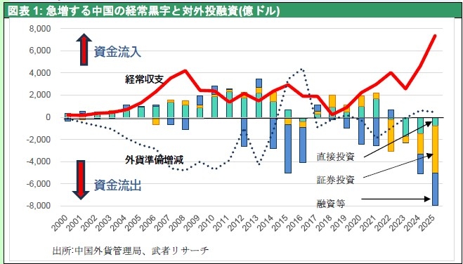 図表1: 急増する中国の経常黒字と対外投融資(億ドル)