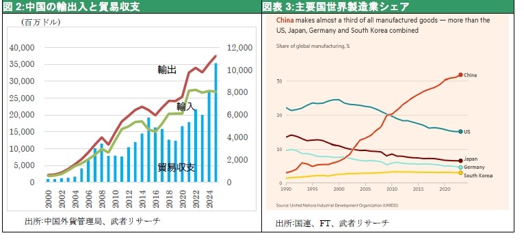 図2:中国の輸出入と貿易収支 図表3:主要国世界製造業シェア