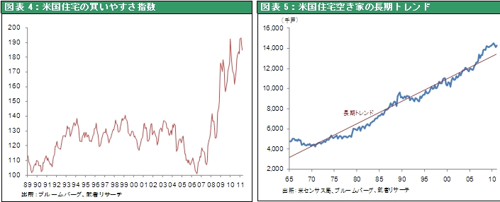 米国では今年前半、①東日本大震災によるサプライチェーンの遮断、②政府(特に地方と国防)支出と雇用の削減、③原油価格上昇、④悪天候など、景気減速要因が集中した。しかしいずれも一過性であり、下半期には成長押し上げ要因となる。加えて住宅に底入れサインが出始めた。6月9日Finantial Times紙は昨年4月の住宅取得減税打ち切り以降初めて住宅価格が上昇(全米26都市中24都市で)し、客足が増え始めたと伝えている。サンディエコの不動産業者は「20万から30万ドルのエントリーレベルの住宅はとても買いやすくなったので、実際動いている」と述べている。個別散在需要の変化はこうした曙光から始まる。住宅価格は取得能力から見て著しく割安であること(図表4)、1.3億戸の住宅ストックに対して通年空戸数1420万戸(2011年3月末)とトレンド線より100万戸ほど多い(図表5)が、それは年平均の世帯増加100万世帯、現在の縮小した住宅新規建設50万戸などを考慮すると早晩解消されること(図表6)など、底入れの条件は整いつつある。