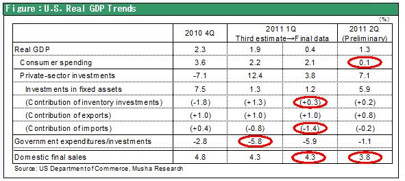 But I believe there will be a major reversal in this pessimism for three reasons: (1) problems involving the hike in the debt ceiling will almost certainly be resolved; (2) the actual state of the U.S. GDP does not warrant pessimism; and (3) stocks were sold off because of pessimism among speculators. Taking a close look at the U.S. GDP is the most important point of all. The large downward revision in the first quarter growth rate was caused almost entirely by downward revisions to two important components: inventories and imports. There was absolutely no change in domestic demand and the economy has not lost momentum. Revising inventory investments downward caused the quarter-on-quarter growth rate in private-sector investments to plunge from 12.4% to 3.8%. Furthermore, the increase in imports was revised sharply upward from 5.1% to 8.3%.