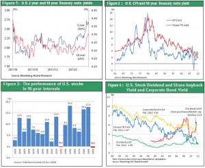 Investors have started to sell off substantial holdings of bonds as the sustained upturn in U.S. stocks continues. After falling to a low of 1.82% on January 31, the 10-year Treasury note yield has rebounded to 2.38% (March 19). The 2-year yield reached a low of 0.21% on January 27 and subsequently rose to 0.41% (March 14). An increasing number of investors believe that long-term interest rates bottomed out early in 2012 (Figure 1). Investors are confident that there is no longer any risk of a depression and that the economic recovery will continue. As a result, we are probably seeing the start of a major shift in capital as investors reverse their previous “flight-to-quality” stance. A decline in U.S. long-term interest rates of historic proportions occurred during the past three decades as rates fell from 15% to less than 2% (Figure 2). It was a bull market for bonds on a scale never seen before. But this rally is probably over. If the bond era has indeed ended, the era of stocks will be next. Figure 3 shows the performance of U.S. stocks in 10-year intervals. Stock returns in the 10-year period from 2000 to 2009 were the worst ever, but this difficult phase has probably reached its end.