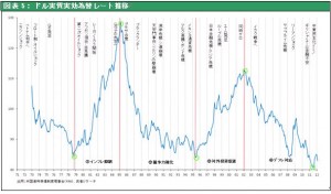 以上のような景気の堅調さ、金利の上昇、株価上昇と言う条件下においては、ドル相場の大転換をもたらす。図表5の長期ドル循環で明らかなように、2002年から2011年まで10年続いたドル安局面もまた終わったということである。